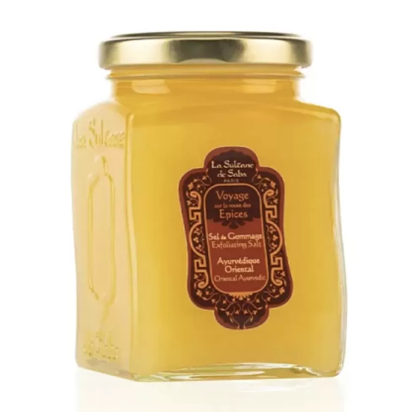 Гоммаж Аюрведический с опьяняющим запахом пачули, амбры и ванили нежно очищает и эксфолиирует кожу, активно усиливает капиллярное кровообращение.